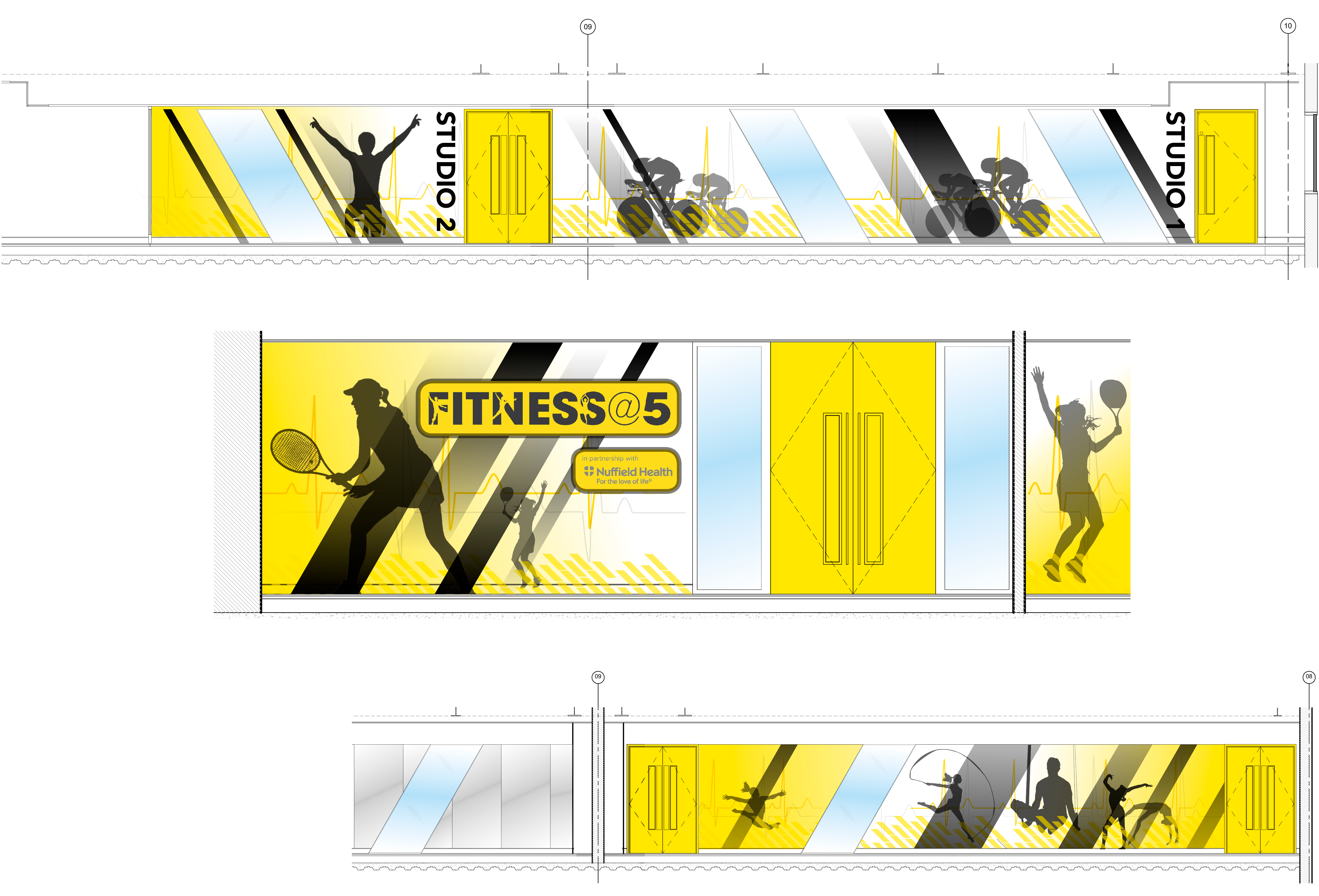 The artwork I developed integrated the colour palette of the space with stylised, traced silhouettes of relevant sporting figures—such as Sir Chris Hoy for the Spin Studio—to bring energy and personality to the environment. The result not only created a dynamic workout setting but also introduced a subtle, engaging “guess who” element for users to enjoy.